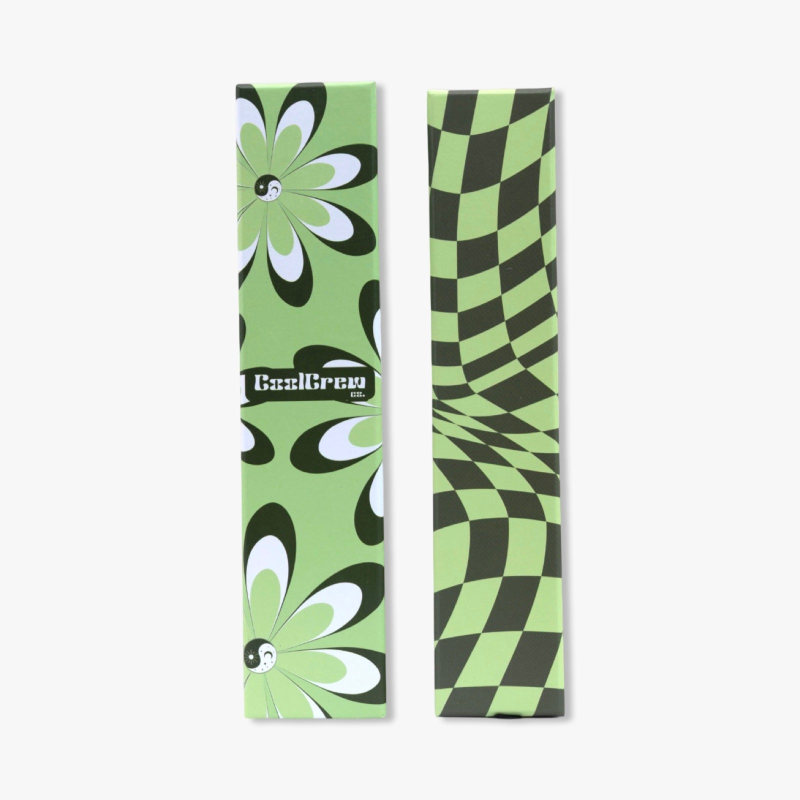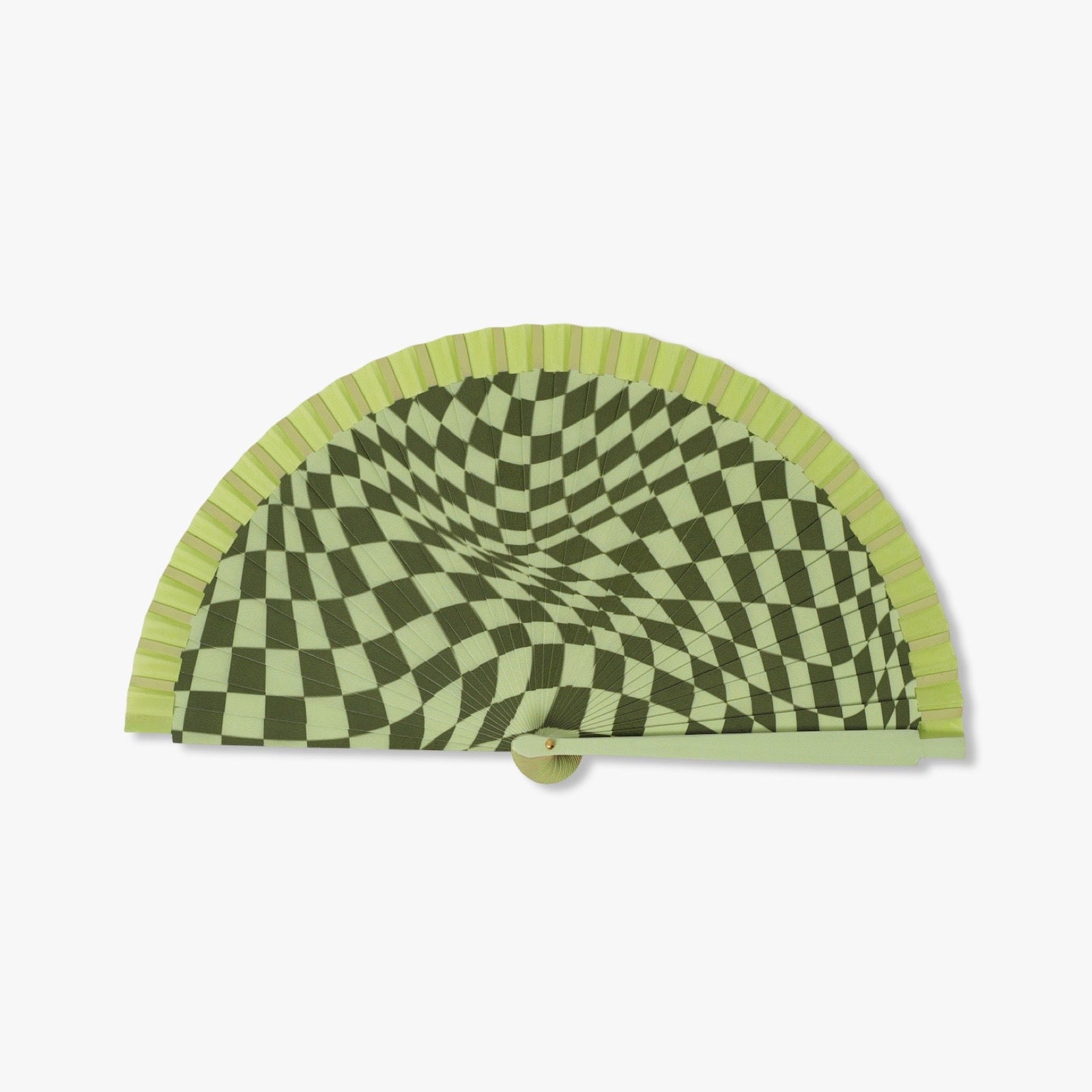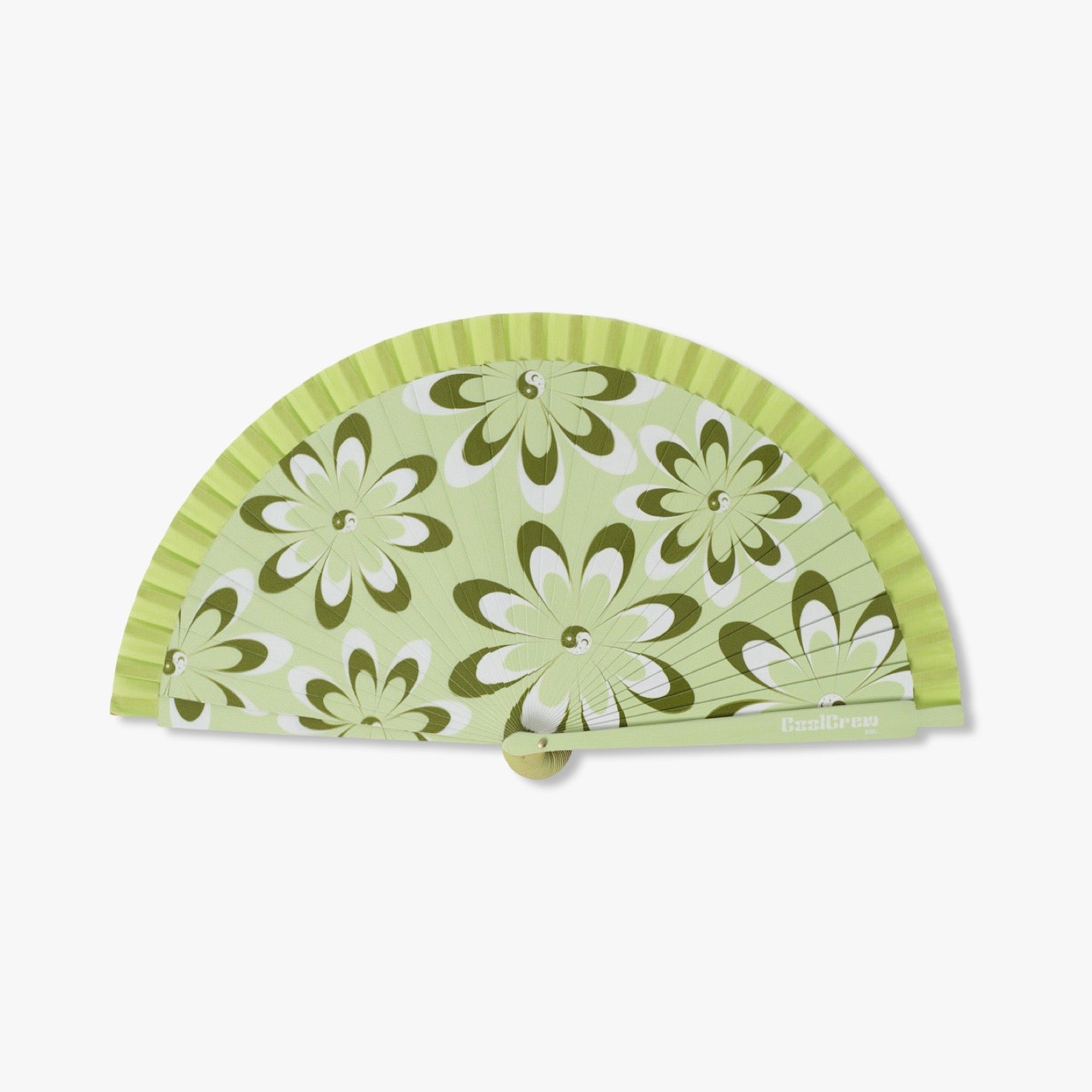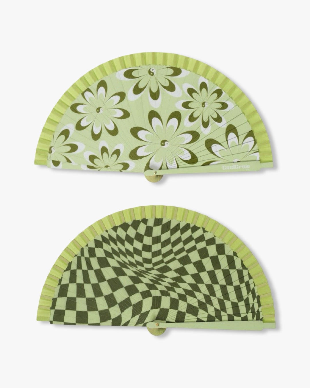 She's retro, radiant and just the right amount of wavy. With oversized daisies blooming in balanced harmony and a yin-yang twist at the center of it all, this fan brings peace, play and a touch of flower-child flair. The back side features a warped checkerboard pattern that says "I came to chill, but I'll turn heads while I do it."